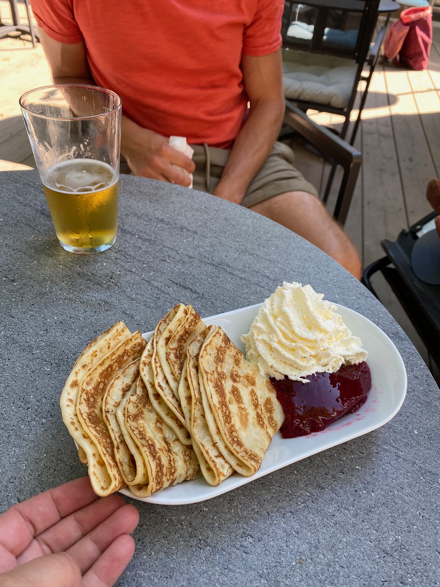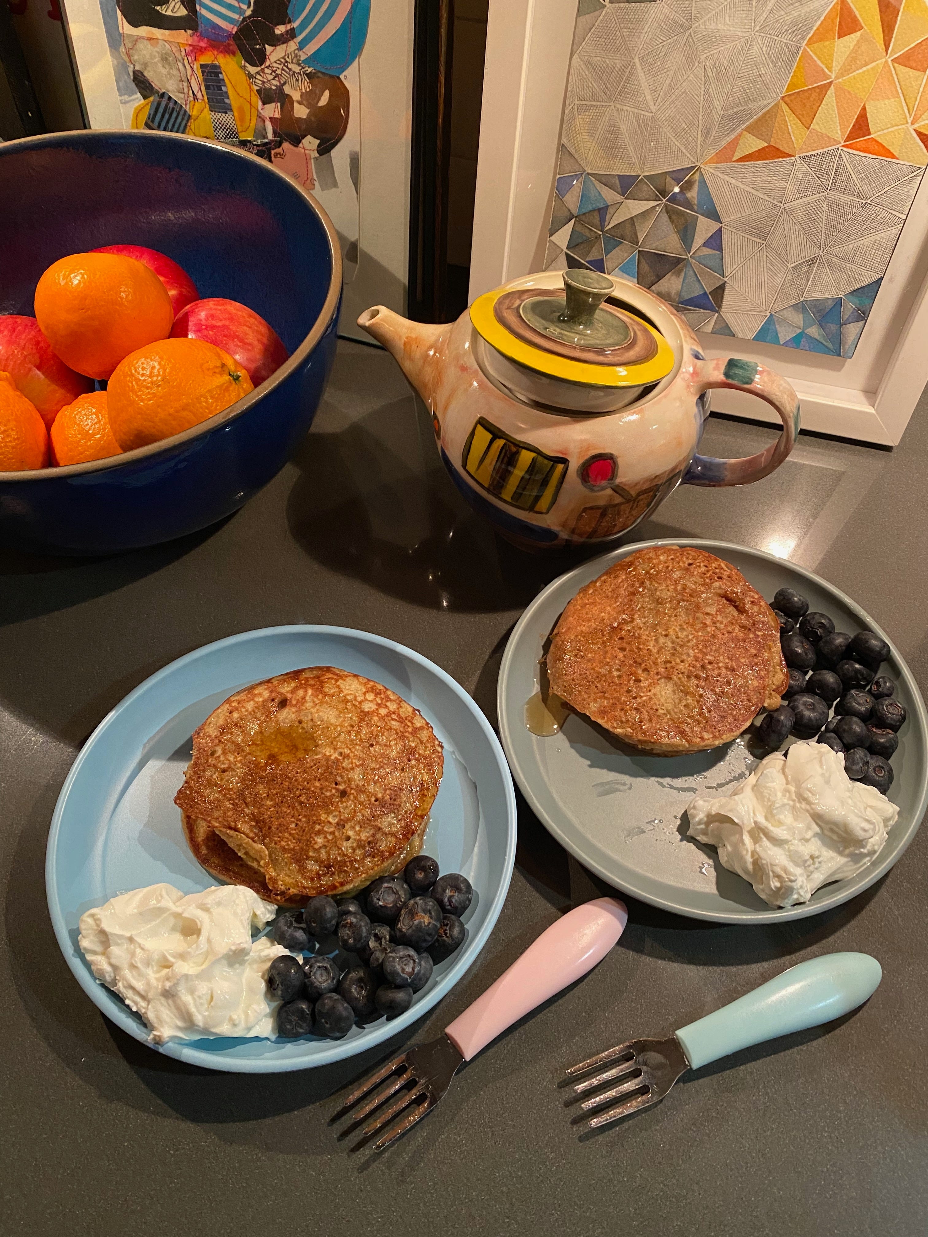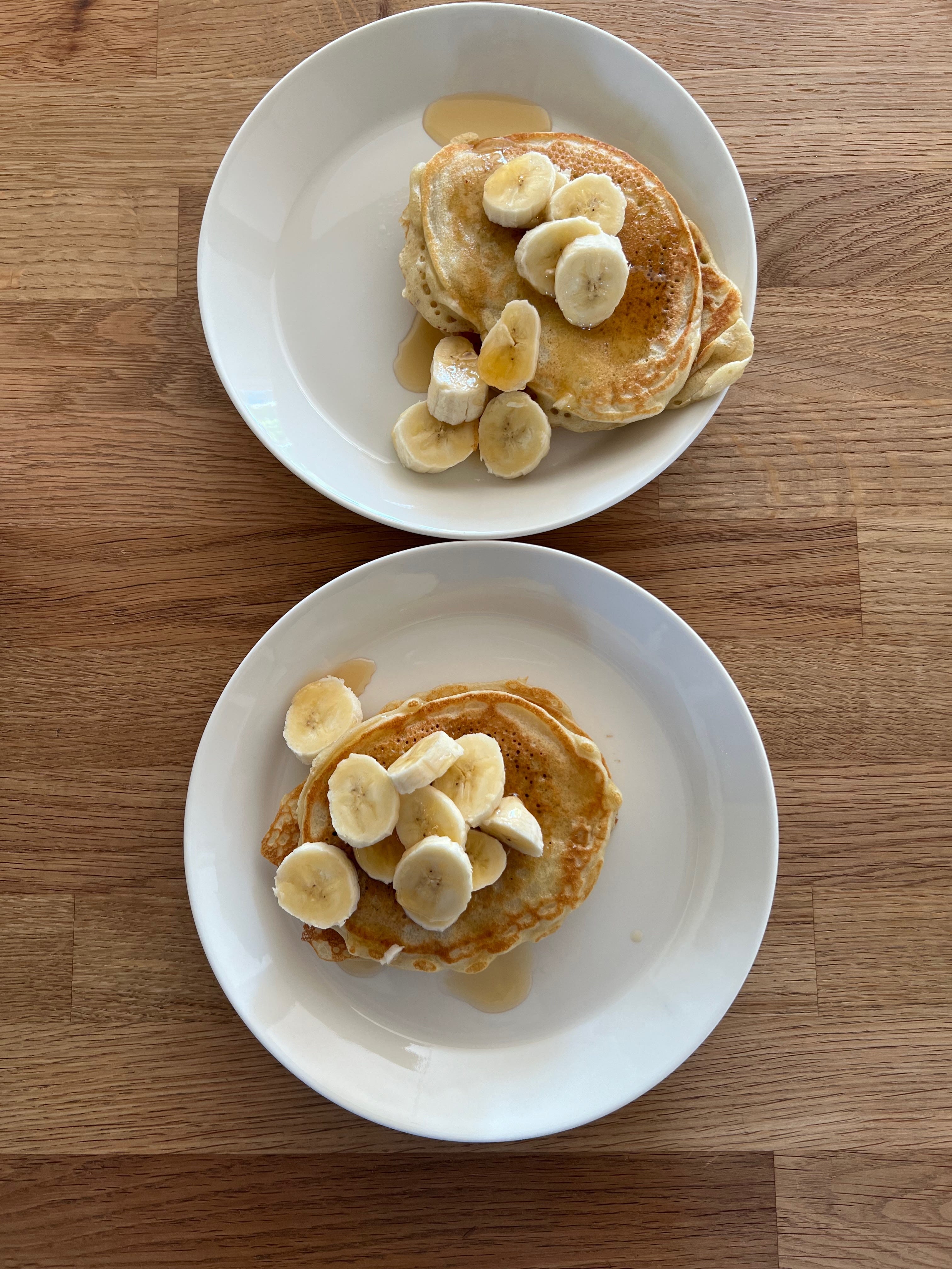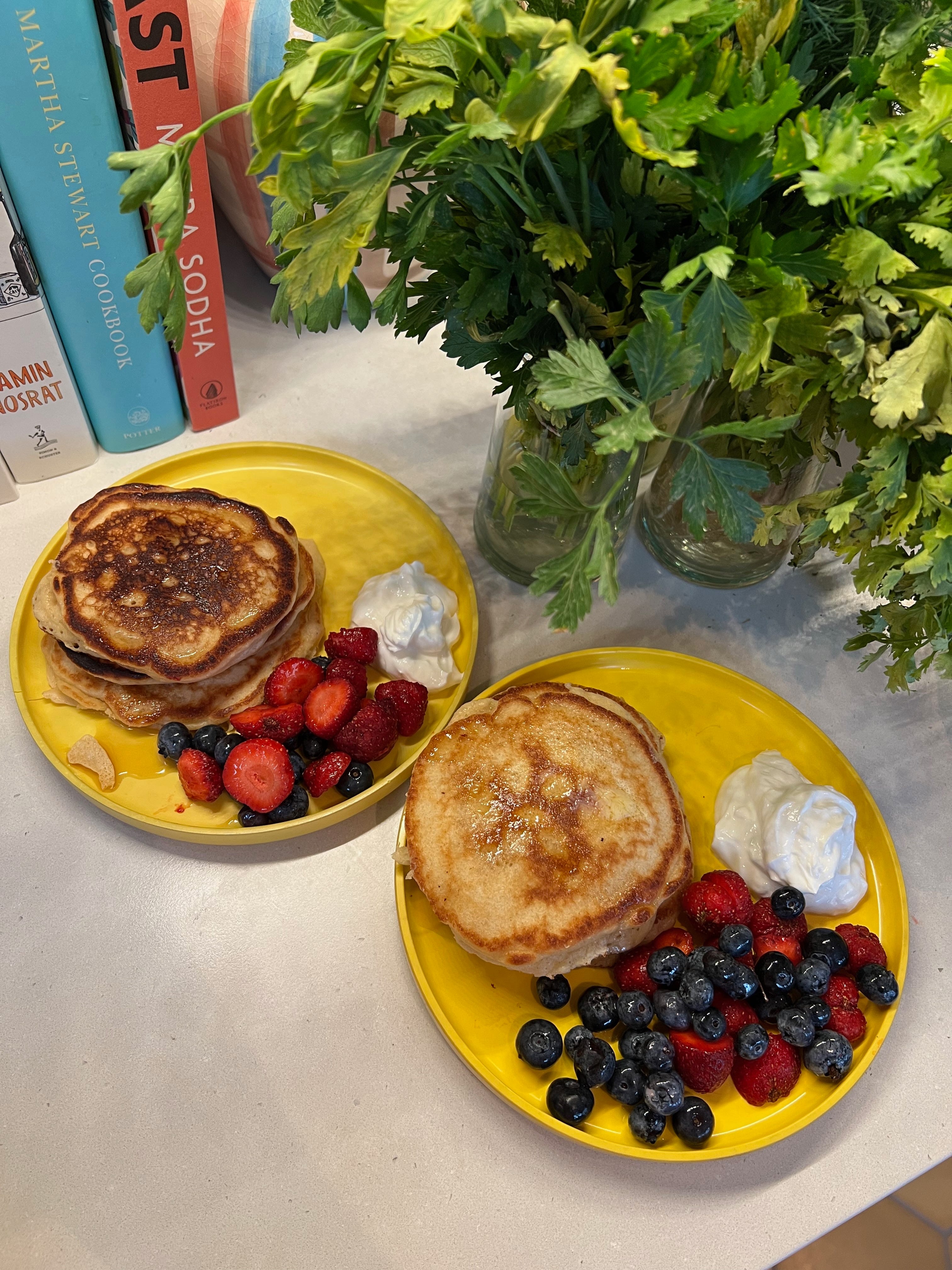 I grew up eating banana or blueberry pancakes made for me every weekend by my dad. But it wasn’t a ritual I carried into my adult life, and I honestly don’t think I ever made them myself until I had kids. I have since tested and tweaked and memorized an easy go-to recipe I use multiple times a week. It is a mashed-up Frankenstein of a recipe from the people I listen to the most when it comes to food, and almost everything else, Alison Roman, Samin Nosrat, Mark Bittman and Anja Tyson. Yes, if you want the absolute fluffiest pancakes in the history of the world, you can separate the eggs and whip the whites and fold them in at the end à la Samin, but I never, ever do that. Except the one time I did and they were heavenly. The pancakes I make are American of course, and not Swedish, but I will give you the world’s simplest example of a Scandi pancake recipe below from my best friend and other life advisor Ole Sondresen, aka Norge, aka Sondreamy, my favorite architect and chef, and you can try that one too.